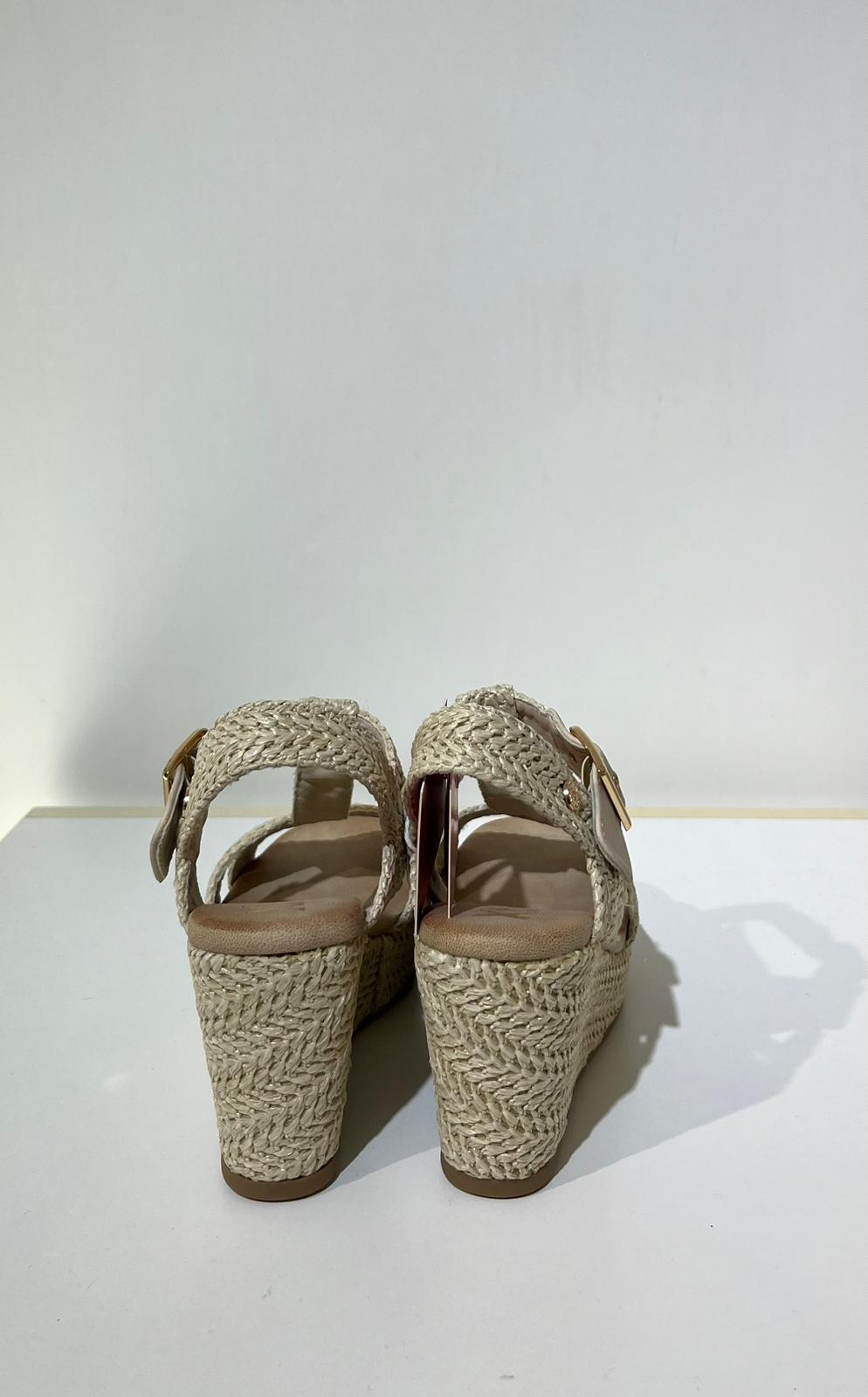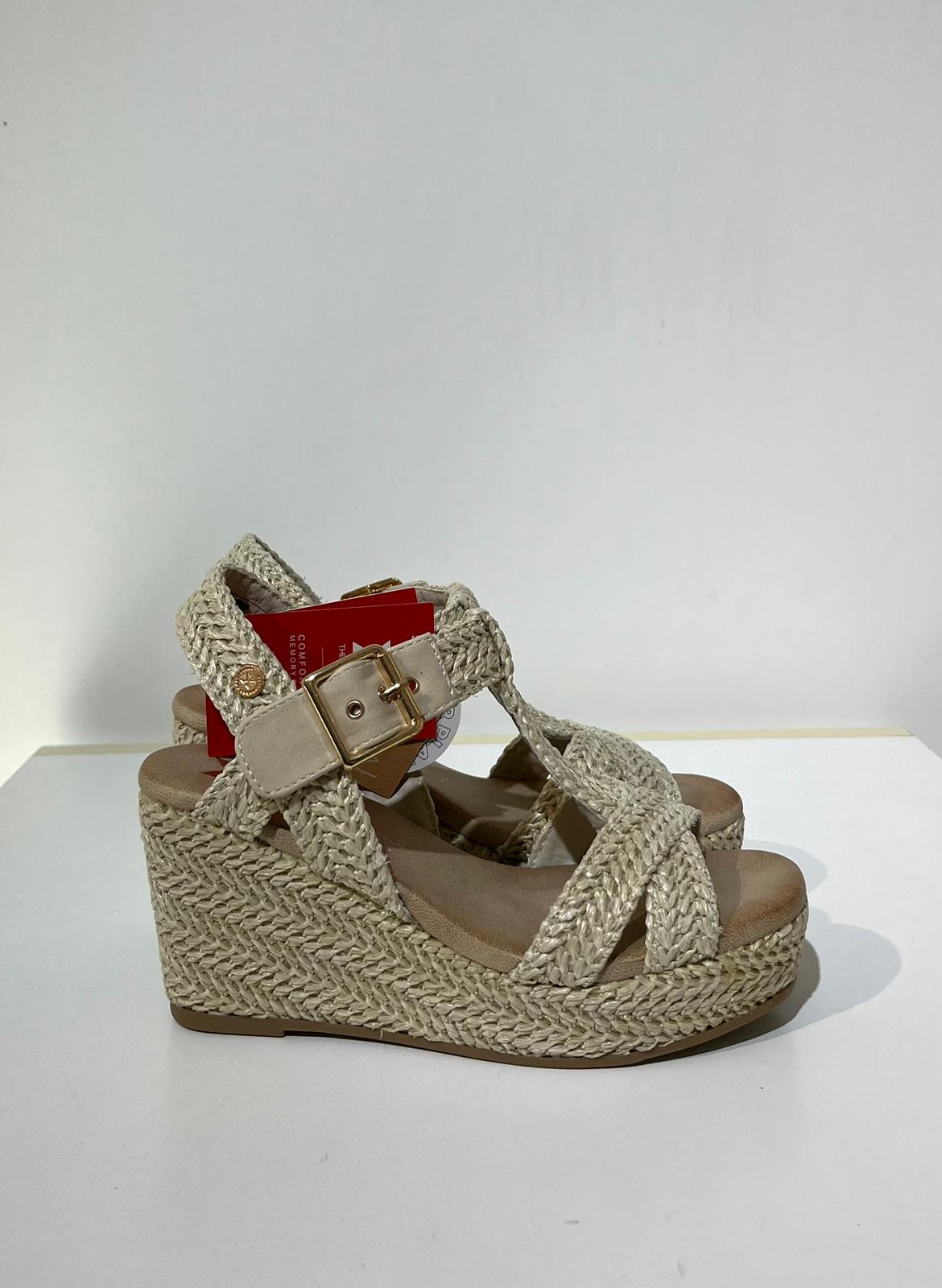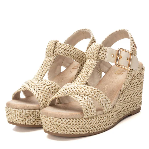 Sandali da donna Xti, realizzati in rafia con una finitura impeccabile. Presentano un elegante design con cinturini intrecciati e cinturino alla caviglia con fibbia in metallo. Zeppa di 9 cm e plateau rivestito in juta, per uno stile naturale e al passo con le tendenze. Suola antiscivolo per una camminata stabile.