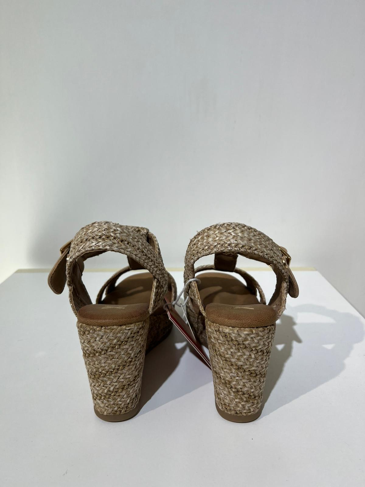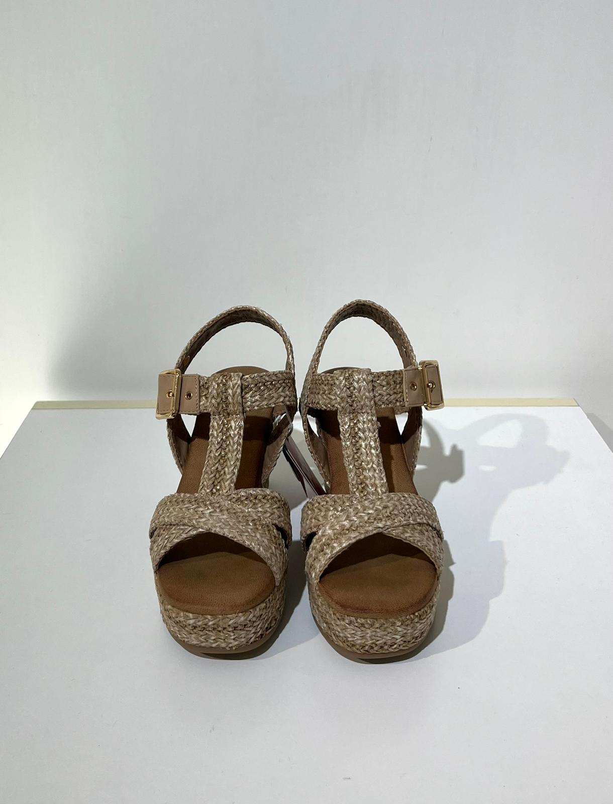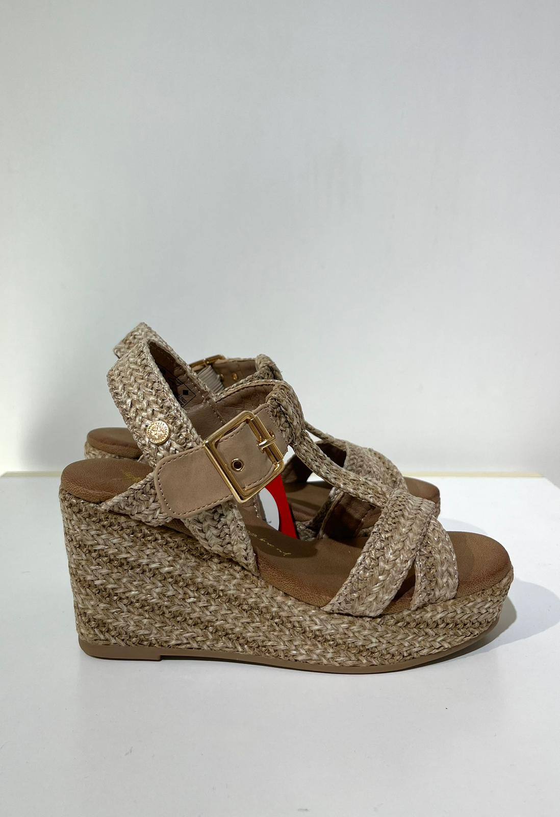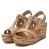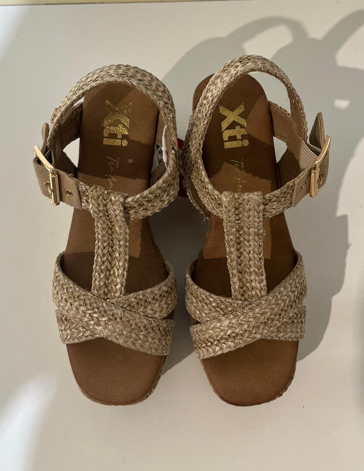 Sandali da donna Xti, realizzati in rafia con una finitura impeccabile. Presentano un elegante design con cinturini intrecciati e cinturino alla caviglia con fibbia in metallo. Zeppa di 9 cm e plateau rivestito in juta, per uno stile naturale e al passo con le tendenze. Suola antiscivolo per una camminata stabile.
